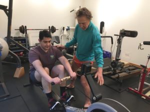 Movement Magic — Learn to practice yoga, bicycle, swim and/or run with awareness and ease. Resident Fellow David Schrom instructs client in use of rowing ergometer in Magic’s exercise facility.